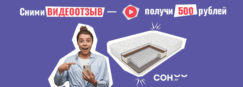 Любой матрас или кровать в интернет-магазине сон.ру стоят на 500 рублей дешевле, чем та же модель у других продавцов (и даже у производителя напрямую)! Ведь мы вернем деньги всего лишь за видеоотзыв о товаре. В акции участвуют все матрасы и кровати, продающиеся в интернет-магазине son.ru.